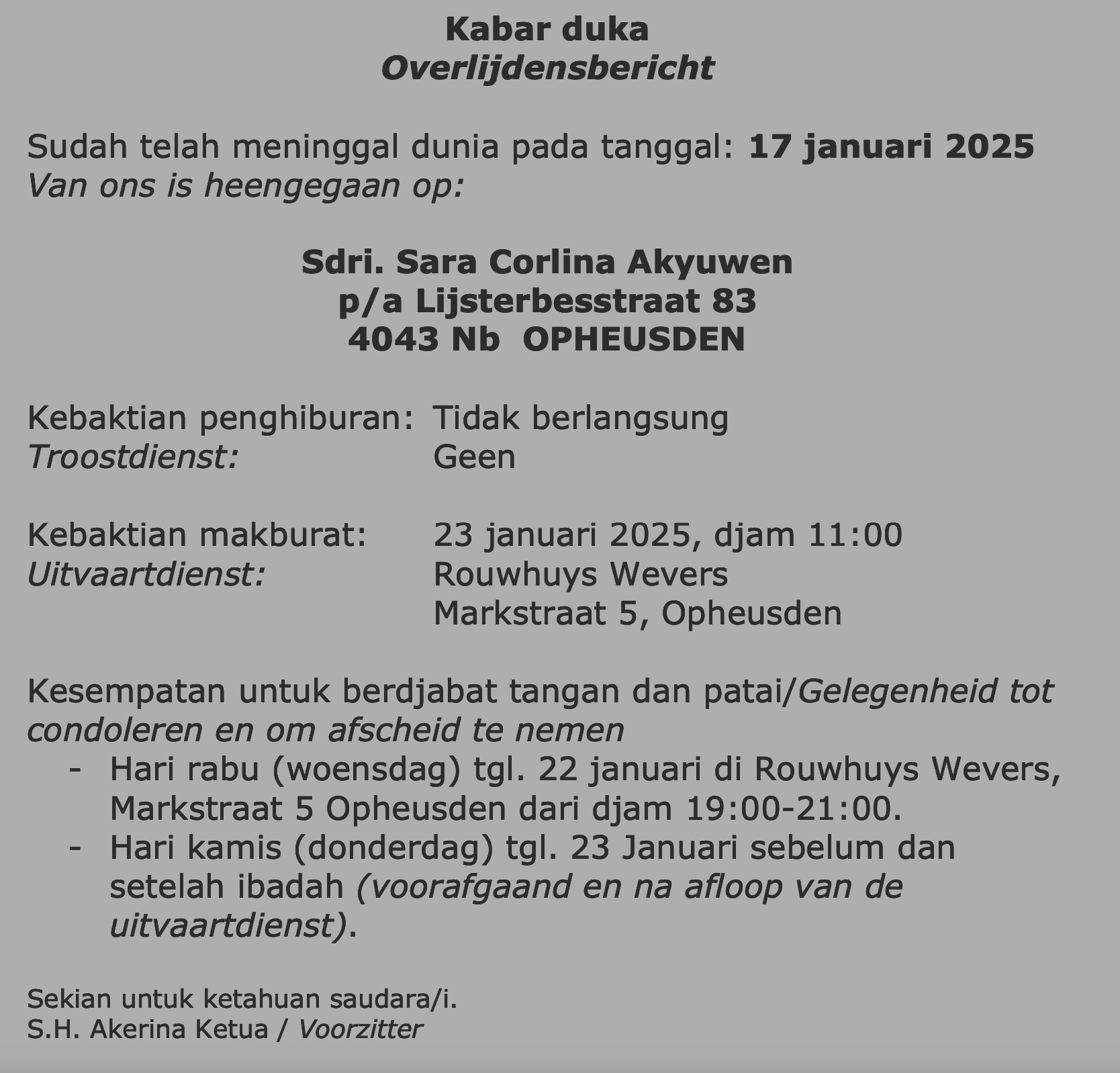 Kabar duka sdri. S.C. Akyuwen